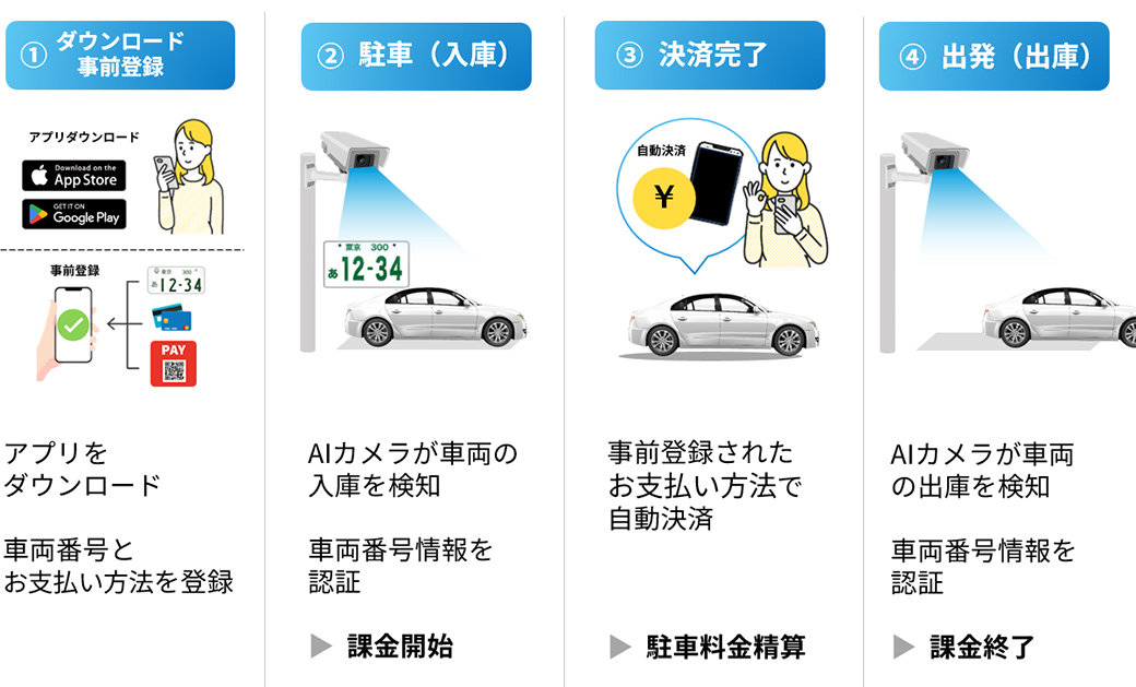 AIカメラで車両ナンバーを自動的に認識し、精算はスマホアプリ上のタッチ操作のみで完了するので、ご利用される方は「停めて、出るだけ。」 駐車場の精算が、とても簡単です。