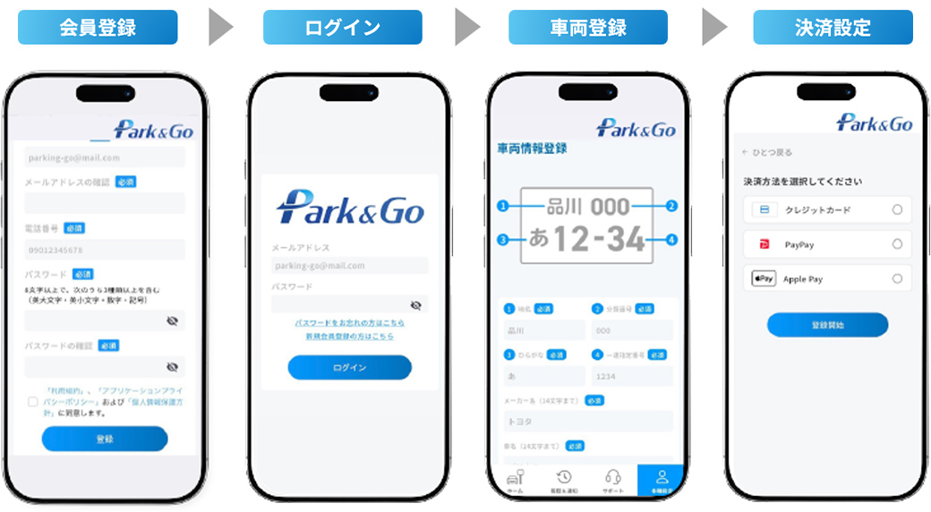 スマートパーキング自動精算アプリ「PARK&GO」は、スマートフォンで事前登録したお客様のアカウント情報(車両ナンバー、クレジットカード等の料金決済情報等)と当社コインパーキングのAIカメラで認証した車両ナンバーを照合し、コインパーキングの料金の支払いが、現金や精算機を使わずに、アプリ上のタッチ操作のみで完了する自動精算サービスです。